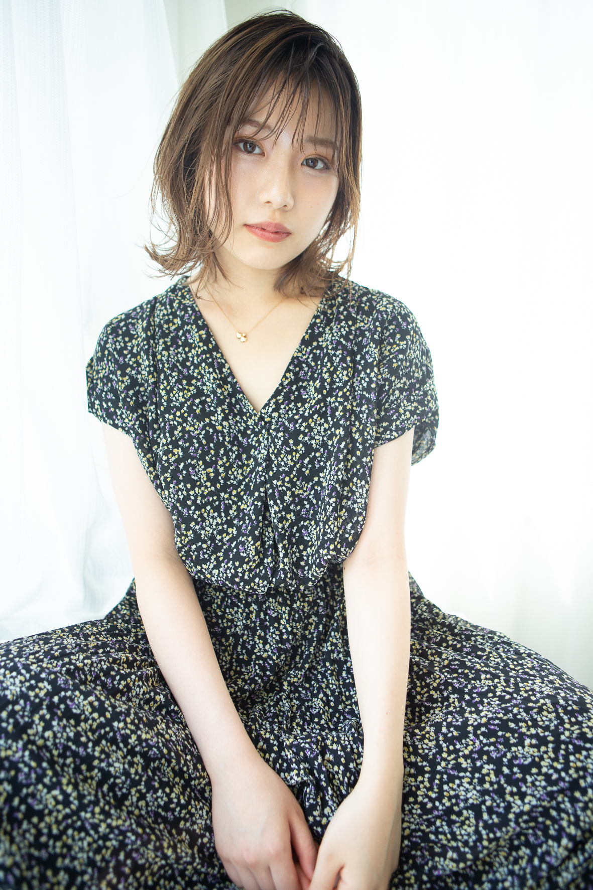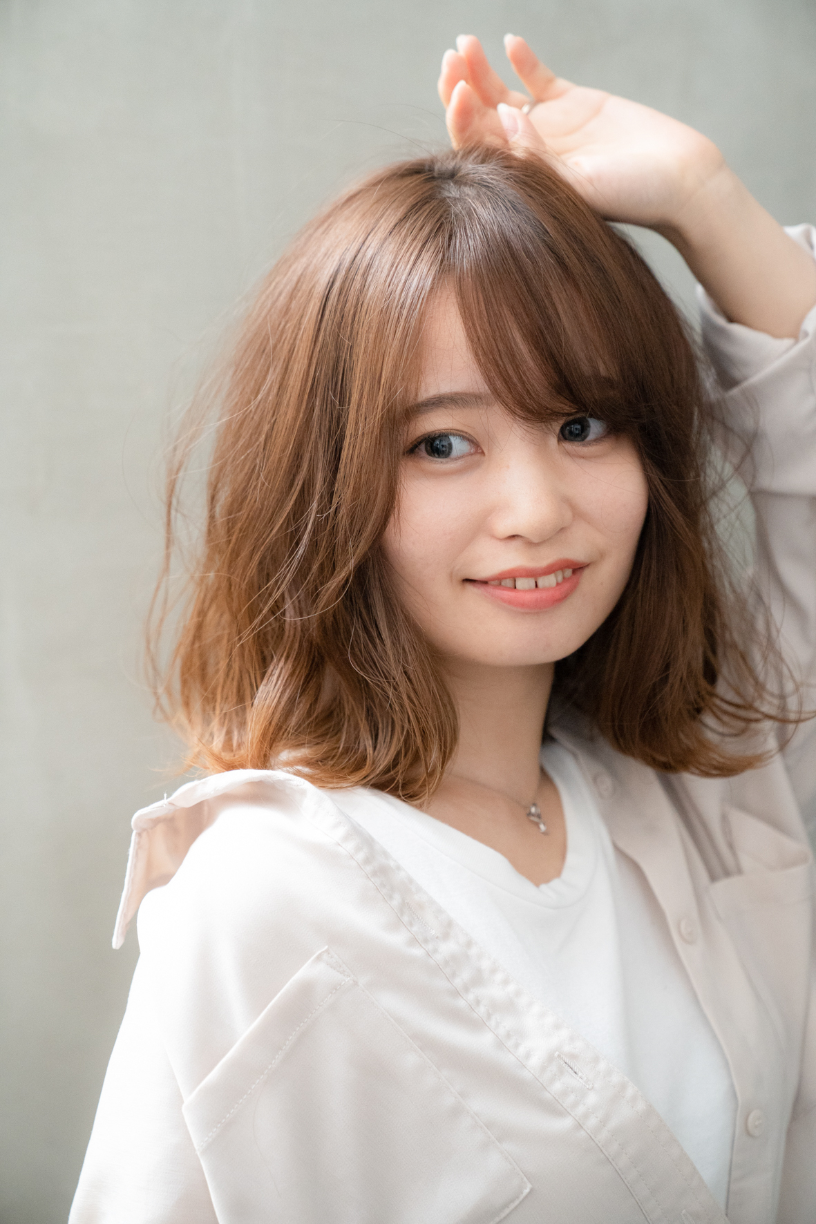 ミディアムレングスのボブスタイル毛先に緩めのパーマをかけることによって朝のお手入れが楽になり、イメージが一段と変わります。